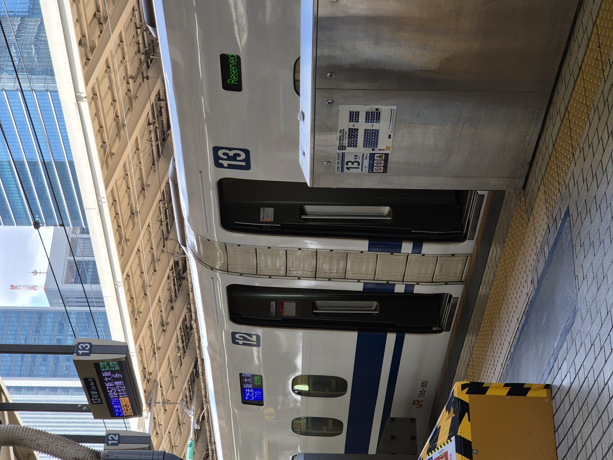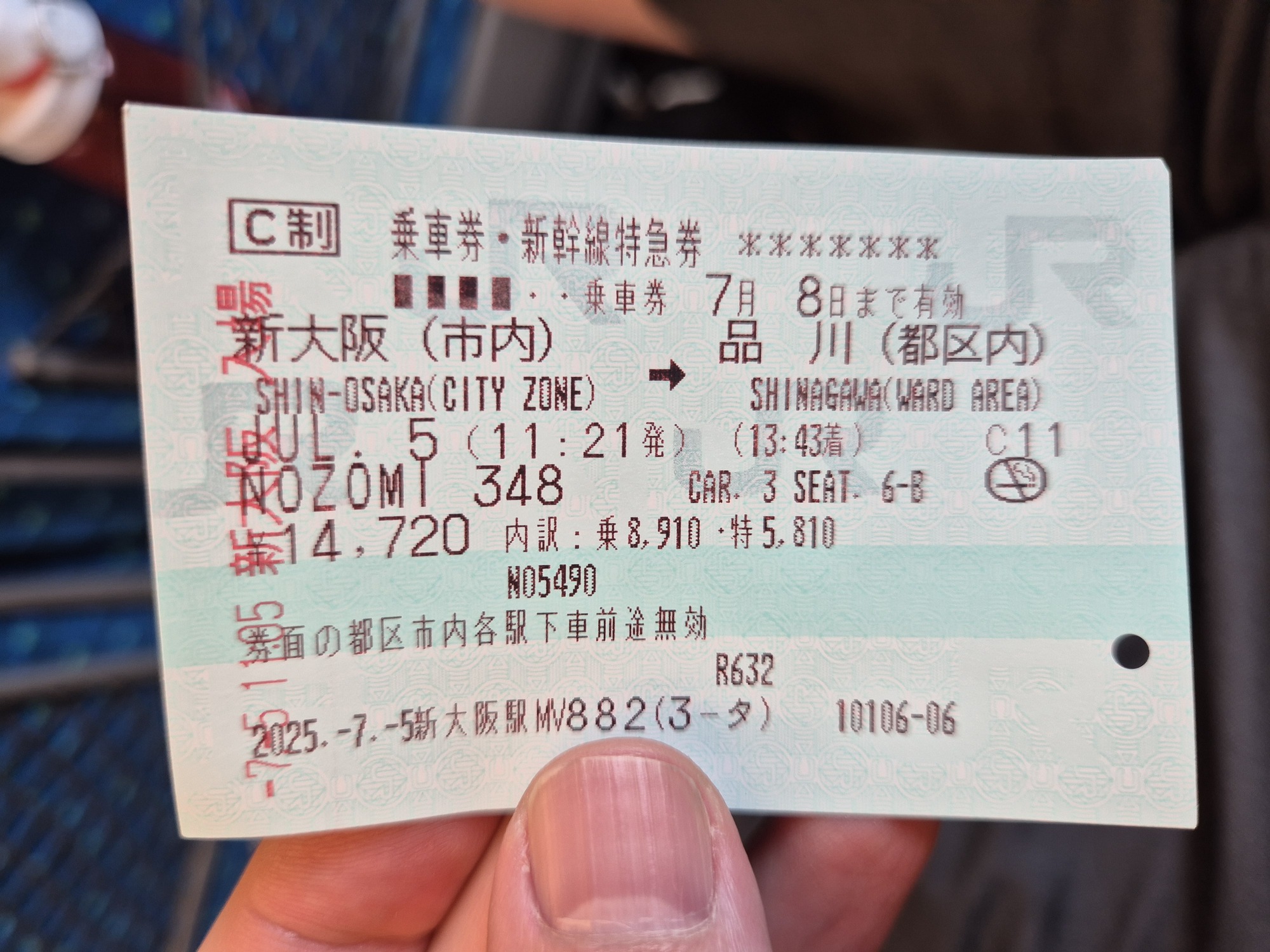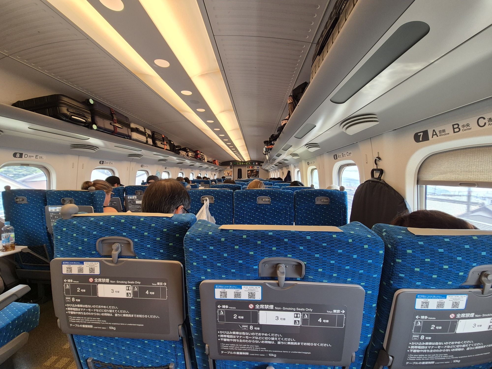 Mi smo z njim potovali 3x, iz Nagoje v Kjoto, iz Osake v Tokio in iz Tokia nazaj v Nagojo. Obstajata 2 tipa kart in posledično tudi 2 tipa vagonov. Karte z rezervacijo, so veljavne za točno določen vlak, vagon in sedež (te smo kupovali mi). Obstajajo pa še karte brez rezervacije, kjer sedež na določenem vlaku ni zagotovljen. Tipično je večina vagonov namenjena rezervacijam, tako da je bolje sedež rezervirati (če so mesta še na voljo). Mi smo karte kupovali kar na avtomatih, tik pred vkrcanjem, je pa baje to težje ob praznikih. Že zdaj, ko je nizka sezona so bili vlaki kar polni, mesta ob oknih pa že zasedena.