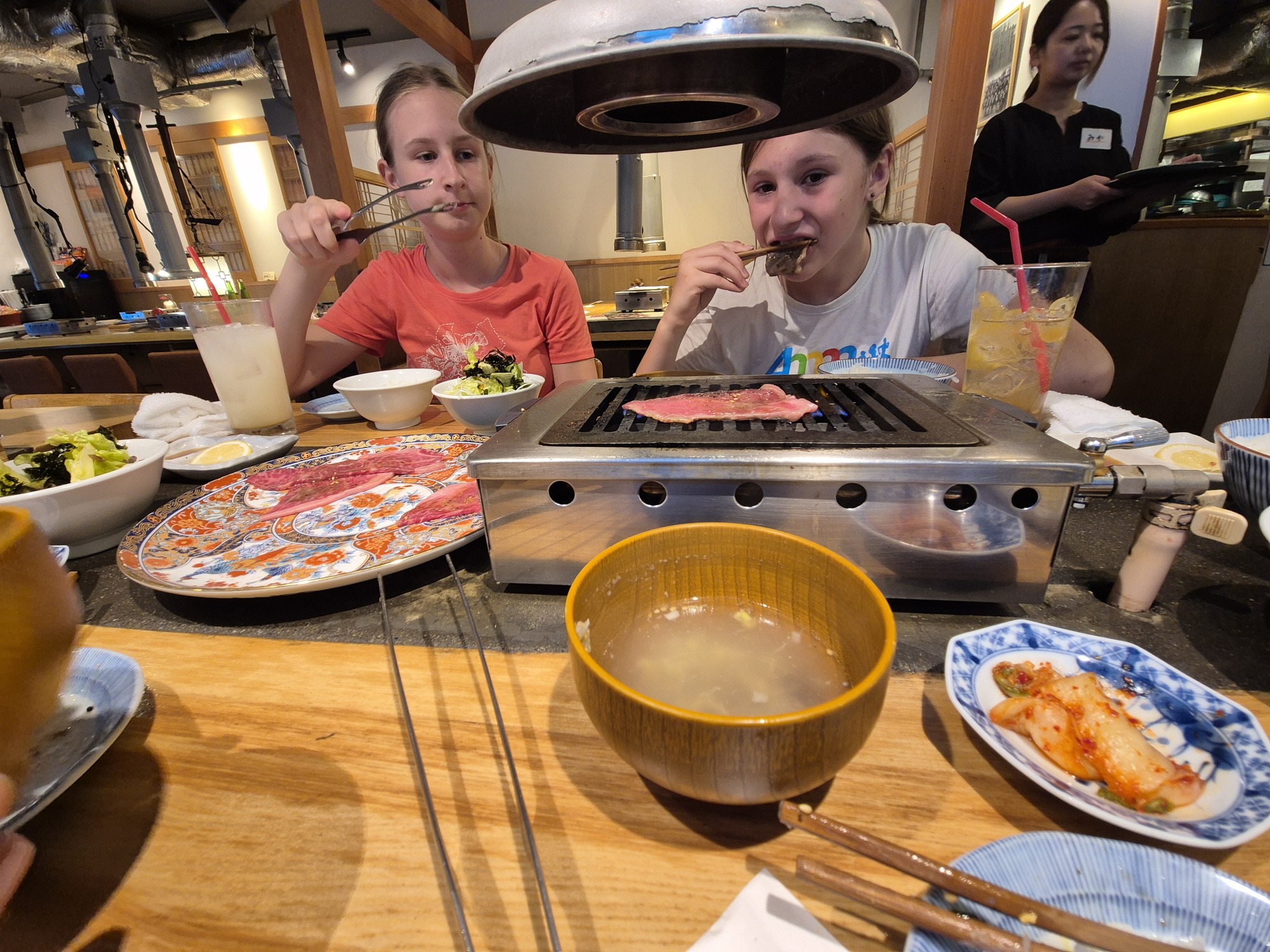 Poskusili smo najrazličnejše dele goveda, od bolj cenjenih, kot so rebra, hrbet in jezik pa tudi drobovino, na primer jetrca in vampe (meni najljubše). Zraven smo naročili še riž, zeleno solato z algami in kimči (korejsko kislo zelje). Vse skupaj smo poplaknili z mrzlim pivom. To je bila to najboljša japonska hrana do sedaj.